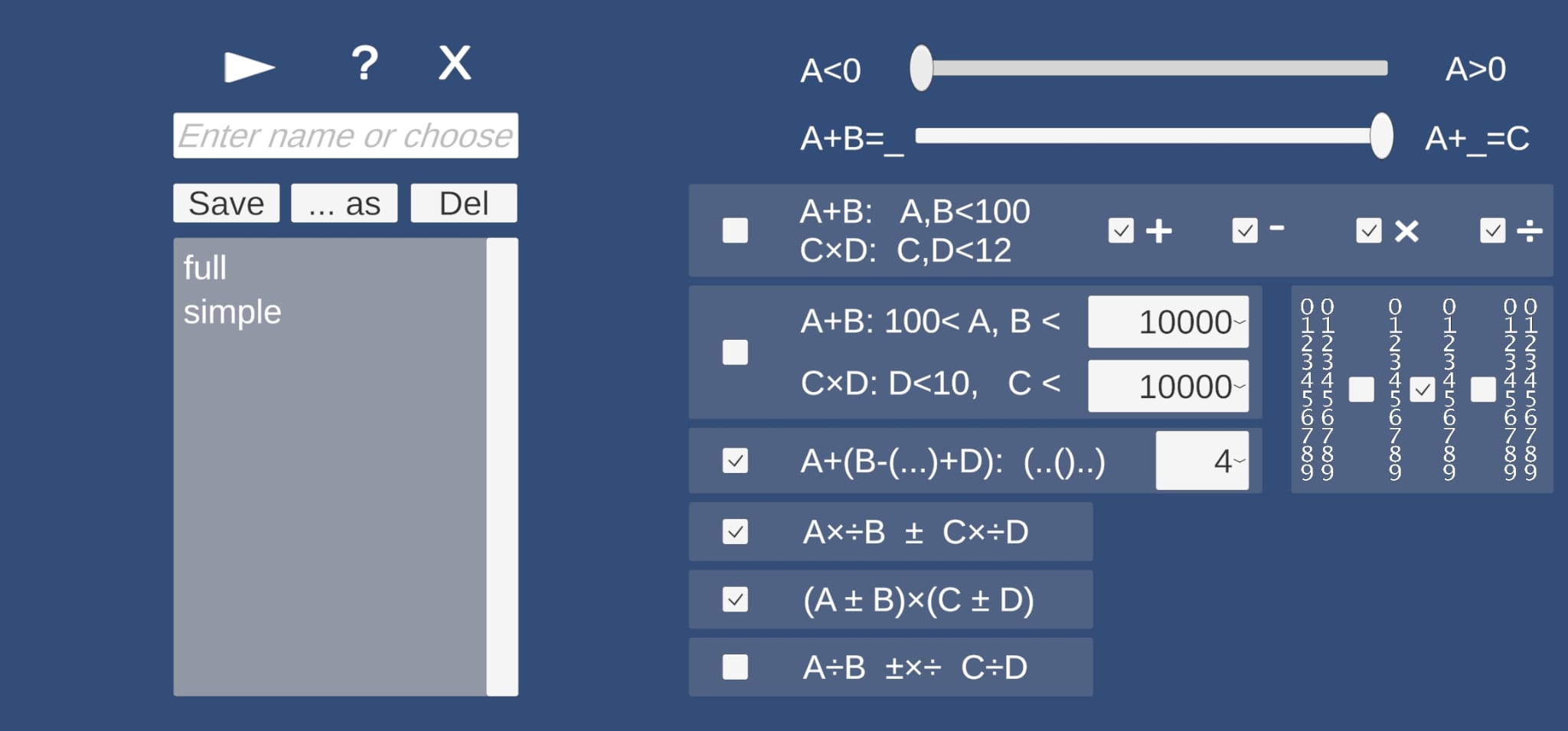 The game can be configured to keep all terms positive (as in 1 + _ = 3 or 10 – 6 = _), or making them all negative ( -1 - (-_) = 1 ), or mix those situations ( 4 + (-7) = -_ ). It is possible to set the proportion of calculation vs missing number problems. It is possible to save and restore various game configurations.